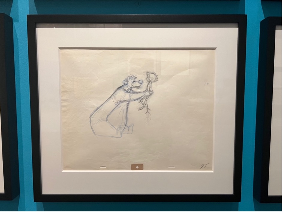 One of the animation key master setups that I was hoping to see was a piece that was previously in my collection. I was not disappointed! I remember back in my early days of collecting that Jeff Lotman, a noted early collector of animation, had acquired a beautiful pan background from the Temple Ruins with Mowgli and King Louie. I had always loved that piece with its beautiful background detail of King Louie’s throne. He later sold this through Sotheby’s and I was lucky enough to trace the piece after that sale to purchase it from another collector in Pennsylvania. Several years later I became acquainted with Andreas to whom I sold the piece. It is always interesting to learn the provenance of art and where and how it is found. The fun things I enjoy about collecting animation artwork are the stories behind each piece you discover. What journey did the art take to end up in your personal collection? It was fun to be reunited with the piece during the exhibition. Now it is on display for others to enjoy!